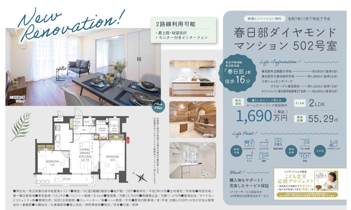 仲介手数料は無料です。こちらは、春日部市粕壁東4丁目にあります平成2年10月に建築された築35年の中古マンション2LDKです。5階建ての5階部分、最上階となります。お部屋の広さは55.29㎡(16.72坪)で、入居するご家族の人数によっては少し狭さを感じるかもしれません。またバルコニーは、西側を向いていますので、午後からの日当たりが良さそうです。午前中の日当たりや採光具合につきましては、ご内見時に確認なさってくださいね。最上階の5階で風通しや眺望は良さそうですね!今回、室内のフルリノベーションをしております。大変綺麗な状態でお引越し頂けますよ。管理費は、13,700円で修繕積立金は、11,470円となります。マンションをご検討される場合には、こういった費用がどのくらいかかるか・・・また経年により金額が上がる可能性も考えられますので、もし将来増額された場合にも支払えるかどうか、しっかり確認が必要です。駐車場は、現況空が有りますが、お引渡し時には空き状況は変わることがありますので、この点は視野に入れておいてください。生活施設において、駅は春日部駅徒歩16分程度となります。買い物施設は、ジャパンミート春日部店(約400m)やコープかすかべ東店(約750m)が近くにあり便利です。学区域は、粕壁小学校(約450m)、春日部中学校(約1,880m)エリアとなります。小学校は徒歩圏ですが、中学校は少し距離を感じるかもしれません。ライフラインは、都市ガス・本下水は整備されております。以上を参考にご覧になってみてください! 【ライフインフォメーション】粕壁小学校 約450m、春日部中学校 約1,880m、ジャパンミート春日部店 約400m、コープかすかべ東店 約750m、ドラックストアセキ春日部東店 約300m 【リフォーム内容】 2025年リノベーション完了 【設備】都市ガス、本下水 【備考】管理費、修繕積立金、駐車場空きあり、総戸数 【マンションの確認ポイント】バルコニーの向き・大規模修繕の状況・管理費修繕積立金がいくらか・駐車場の空き有無及び月額などです。 ◆前面道路の過去の水災被害の有無に関しては、個別に調査いたしますので、ご希望の方はお気軽にお問合せください。 ◆資料のご請求・物件に関するお問合せ・内覧のご予約は、メール:info@style-p.com フリーダイヤル:0120-40-2103まで、お気軽にお問合せください。ご連絡お待ちしております! |