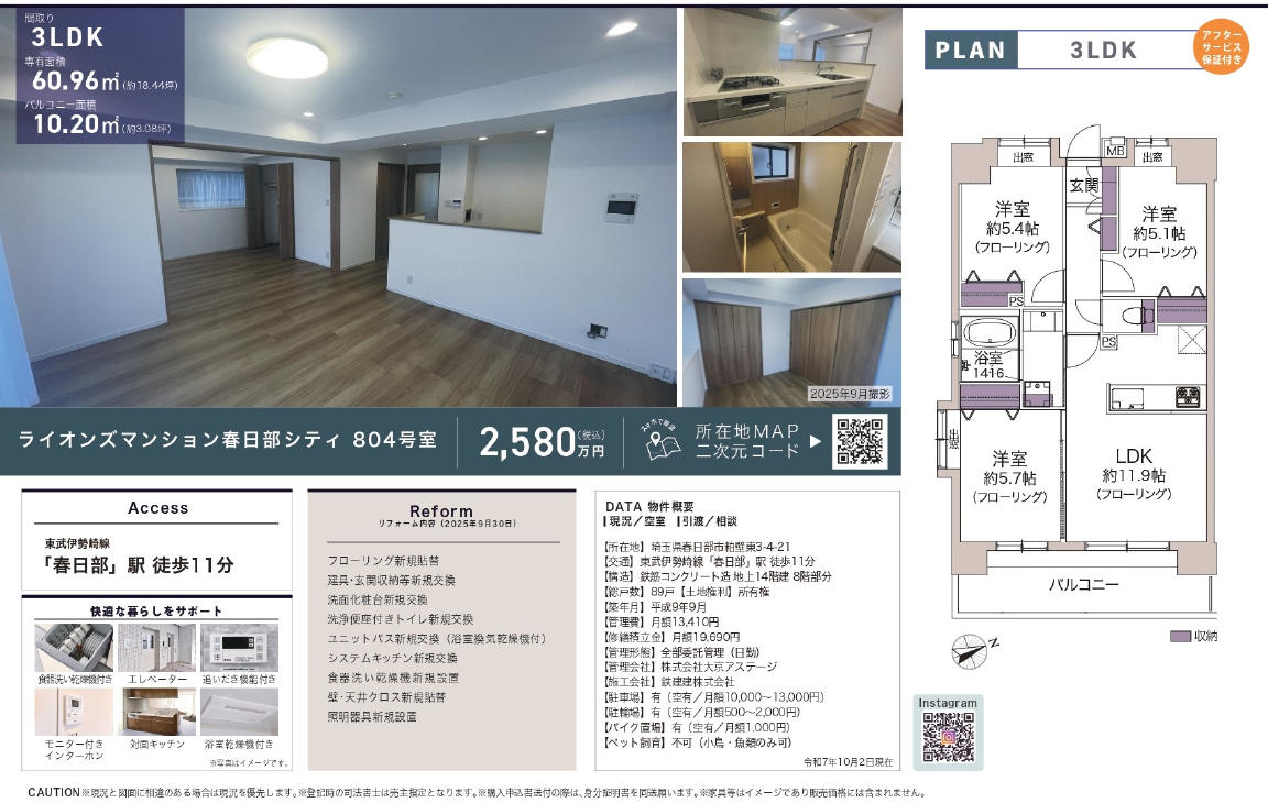 仲介手数料は無料です。こちらは粕壁東3丁目にございます、「ライオンズマンション春日部シティ」の8階部分の部屋です。平成9年に建築されたマンションで、広さ60.96㎡(18.44坪)の3LDKとなります。室内は令和7年9月にリフォームが完了しました。本件は東棟の角部屋となり出窓等もございますが、日当たりについては午前中中心となるものと思います。当マンションの向かいには高層賃貸マンションも建っておりますので、ご内見の際には日当たり具合をしっかりとご確認くださいね。また、マンションをご検討なさる場合には住宅ローンの他に、管理費13,410円、修繕積立金19,690円が毎月かかります。また経年によりそれらの金額が上がる可能性も考えられますので、もし将来増額された場合にも支払えるかどうか、しっかり確認が必要です。現在、 敷地内駐車場は空きがあるようですがご契約までに満車になる場合もありますので、契約前に再度ご確認なさってくださいね。生活施設において、駅は春日部駅まで徒歩11分程度です。お買い物はコープ春日部テラスまでは350m(徒歩5分)でとても便利です。学区域は、粕壁小学校(約260m)、春日部中学校(約1220m)と小学校が近く、小さなお子様のいらっしゃる方は大変安心の距離です。以上を参考にご覧ください! 【ライフインフォメーション】粕壁小学校 約200m、春日部中学校 約1,220m 、コープ春日部テラス(約350m)、ララガーデン春日部 約750m、セブンイレブン粕壁東3丁目店 約120m、ドラックセキ春日部東店 約280m、春日部市立図書館 約200m 【リフォーム内容】令和7年9月リフォーム済:フローリング新規貼替、建具・玄関収納新規交換、洗面化粧台交換、トイレ新規交換、ユニットバス交換(浴室換気乾燥機付)、システムキッチン交換、食器洗い乾燥機設置、壁・天井クロス貼替、照明器具新規設置 【設備】都市ガス、本下水 【備考】管理費、修繕積立金、総戸数89戸、オートロック、宅配ボックス 【マンションの確認ポイント】バルコニーの向き・大規模修繕の状況・管理費修繕積立金がいくらか・駐車場の空き有無及び月額などです。 ◆前面道路の過去の水災被害の有無に関しては、個別に調査いたしますので、ご希望の方はお気軽にお問合せください。 ◆資料のご請求・物件に関するお問合せ・内覧のご予約は、メール:info@style-p.com フリーダイヤル:0120-40-2103まで、お気軽にお問合せください。ご連絡お待ちしております! |
