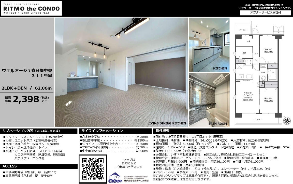 こちらは、中央3丁目にあります「ヴェルアージュ春日部中央」の2階部分です。 平成7年に建築された広さ56.9u(17.21坪)の3LDKです。 |