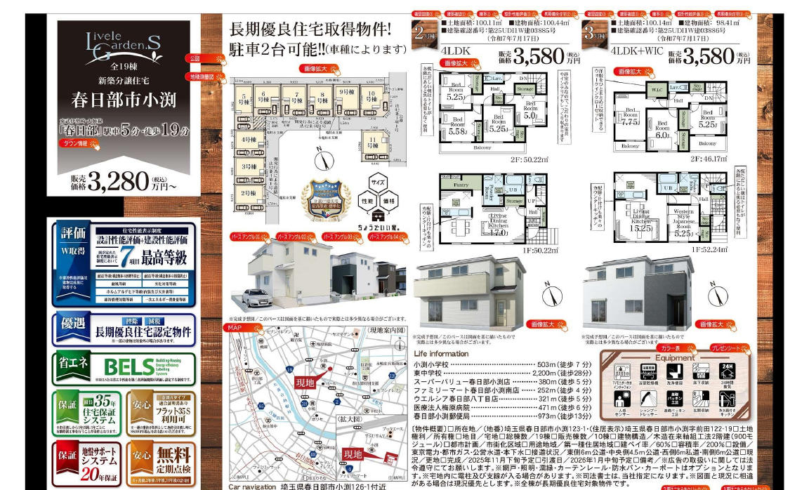 こちらは小渕にございます全19区画の分譲地の5号棟です。 土地33.99坪、建物は令和7年11月に完成、間取りは4LDK+駐車スペース2台です。 |